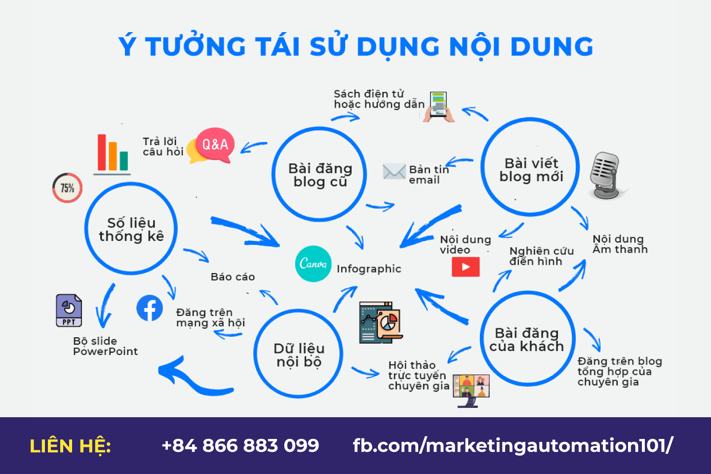Thay vì bắt đầu lại từ đầu mỗi khi bạn tạo nội dung mới, hãy cân nhắc việc tái sử dụng và cập nhật nội dung hiện có. Ví dụ: bạn có thể biến một bài đăng trên blog thành một infographic hoặc sử dụng nó để tạo podcast. Cách tiếp cận này tiết kiệm thời gian và đảm bảo rằng bạn đang tận dụng tối đa nội dung mình đã tạo; không ai rảnh rỗi lưới lại nguồn cấp dữ liệu của bạn để xem những gì bạn đã đăng cách đây một năm.
